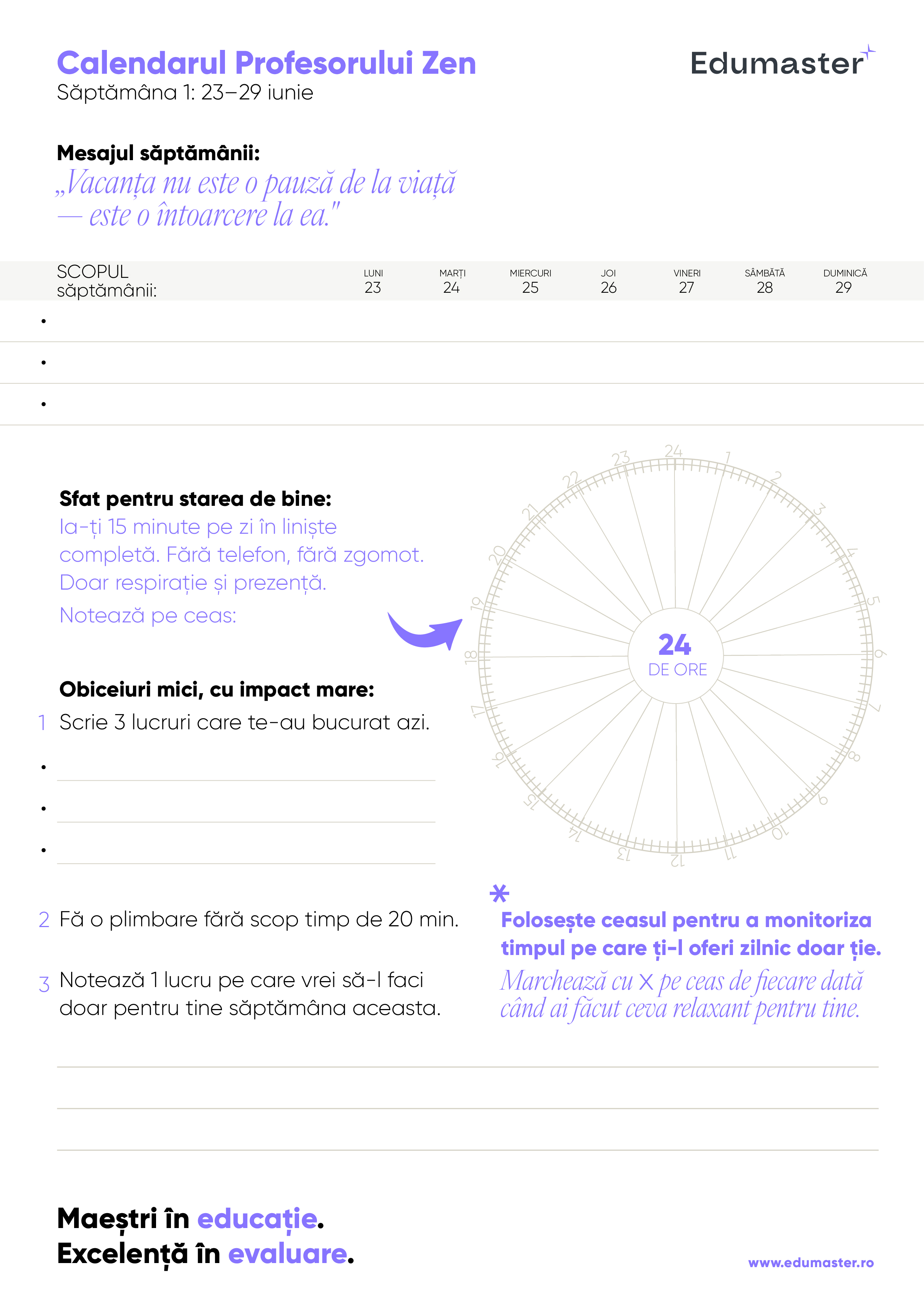 🎉 Calendarul Profesorului Zen – o serie de mesaje săptămânale care îți vor aduce inspirație, echilibru și un strop de senin pe tot parcursul vacanței de vară.