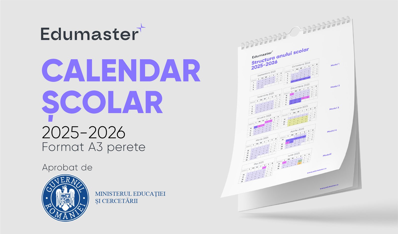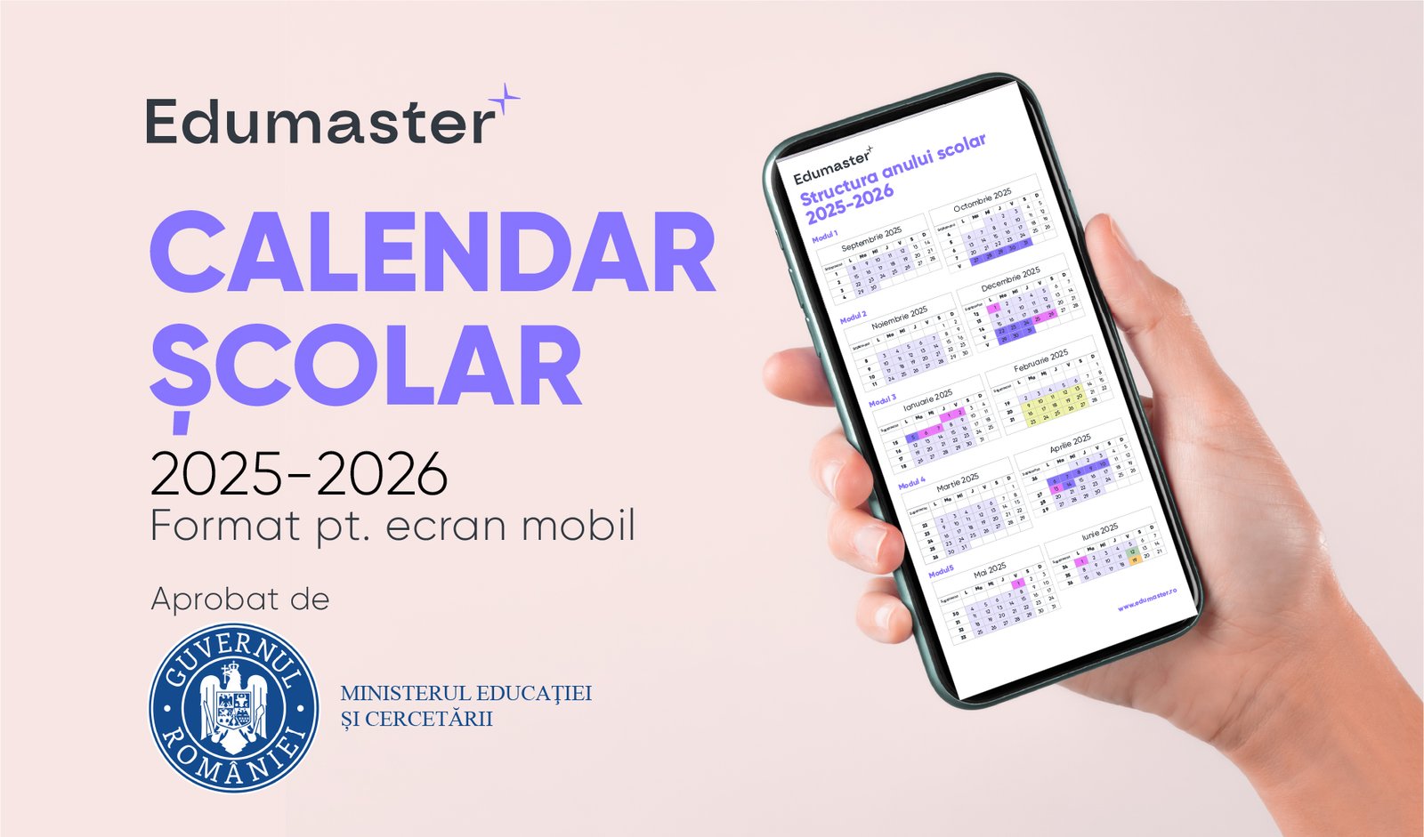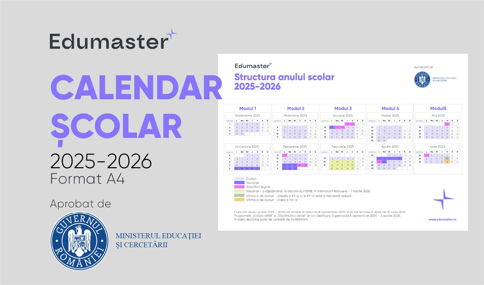 Structura anului școlar 2025–2026 este acum disponibilă pe Edumaster.ro, într-un format clar, actualizat și ușor de descărcat, conform ordinului oficial emis de Ministerul Educației. Calendarul oficial te ajută să vezi rapid cum se împarte anul școlar în module, când sunt vacanțele și ce perioade sunt alocate examenelor sau altor activități importante. Este o resursă utilă pentru profesori, părinți și elevi deopotrivă.